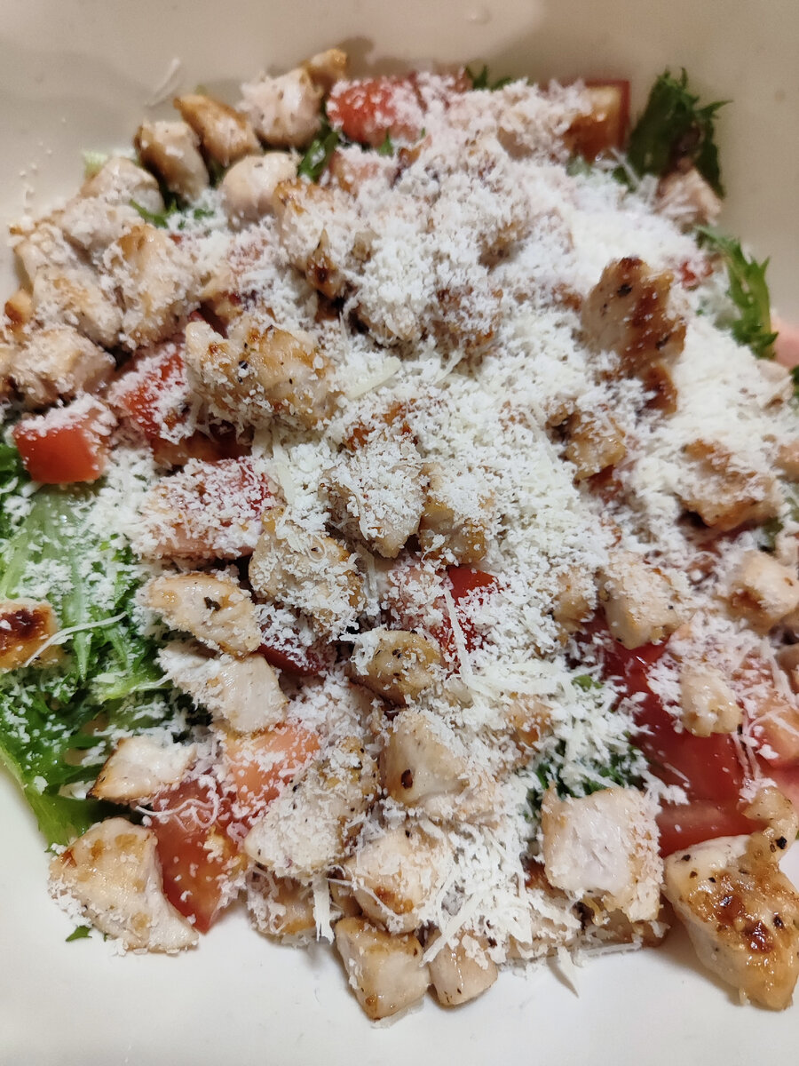 6. Готовой курице даём немного остыть и добавляем в салат. Туда же отправляем сухарики.