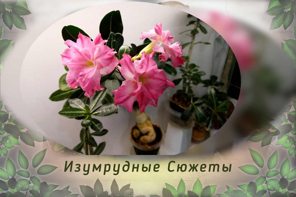 Адениум вполне самодостаточное растение. И с цветами, и без цветов он прекрасен. А когда ждёшь шесть долгих лет, то цветение становится ещё более неожиданным. Вроде бы всегда ждала, осматривала растение, а, увидев бутоны, дышать забыла. Всем привет! Меня зовут Ира. Я - автор канала "Изумрудные Сюжеты". Адениумы , комнатные растения и зарисовки окружающего мира превращаются в Изумрудные Сюжеты, которыми я делюсь с вами Сколько всего за эти долгие шесть лет пройдено и пережито. Сколько Сколько событий произошло в моей жизни. А Адениум молча наблюдал, оценивал, присматривался ко мне. И наконец-то решил, что хозяйка заслужила, выстрадала награду в виде нежных трёхрядных с яркой центральной жилкой воздушно-розовых цветов. Конечно, жаль, что два бутончика отсохли. Но и оставшиеся три чудесны. Пока снимала видео про своего любимца , поняла, что при возможности расположения растений в несколько ярусов цветущий Адениум прекрасно смотрится на фоне мощных листьев диффенбахии, а невесомый аспар