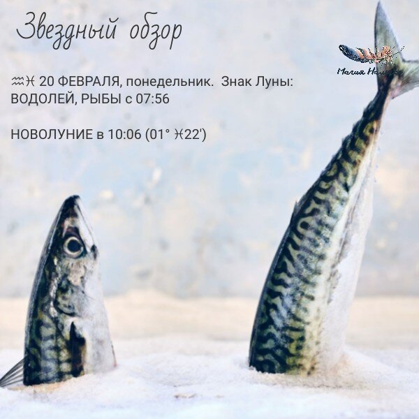 Доброго утра понедельника! ♒♓ 20 ФЕВРАЛЯ, понедельник. Знак Луны: ВОДОЛЕЙ, РЫБЫ с 07:56 НОВОЛУНИЕ в 10:06 (01° ♓22′) Тренды дня: Заныриваем в Новолуние. Оно в знаке Рыб и задает тенденции новому лунному месяцу. Как вчера я говорила, нас будет тянуть в свои внутренние процессы, но внешние обстоятельства будут от нас умение лавировать в потоке разных дел. Лунный месяц нам помимо разных неотложных дел, которые будут нас отрывать от своих заплывов, будет и богат на возможности. Возможностей разные, не слишком крупные, но если с полной ответственностью их воплощать, то и результат нашего труда порадует нас. Новолуние на соединение с Сатурном об этом нам твердо и ответственно заявляет. А поэтому, берем сегодня в час Новолуния блокнот или заметки и начинаем накидывать план на ближайшие 29 дней. План пусть состоит из обьективных задач и реального взгляда на свои возможности. Плюс желательно продумать по шагам: как, с кем, когда и что понадобится для реализации. И лучше в этот список не вклю