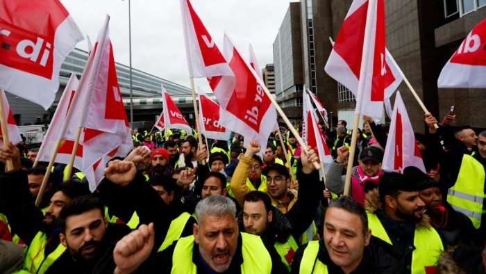 Забастовка работников аэропортов Германии. 7 портов закрыты, 2340 рейсов отменены, 300 000 пассажиров не смогли вылететь.