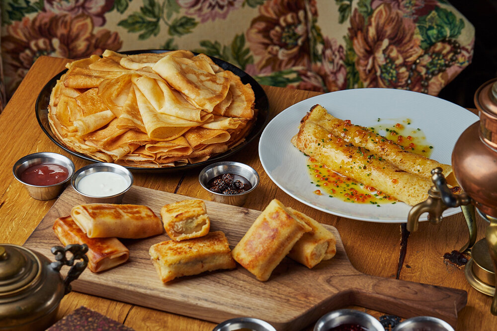 Бренд-шеф ресторана Виктор Белей готовит блины по исконно русскому рецепту с авторскими штрихами и в этом году делает упор на разнообразие начинок и формы подачи. Так блины с лососем и слайсами свежего огурца заворачивает в рулет, классические с угрем закручивает в мини-роллы и подает со слайсом из авокадо, икрой тобико и сусальным золотом, а куриные сердца и томленую говядину дополняет соусом бешамель и по принципу лазаньи выкладывает блинный пирог. На десерт стоит присмотреться к шоколадной обманке — блины в форме эклера с ванильным кремом и юдзу под зеркальной глазурью.