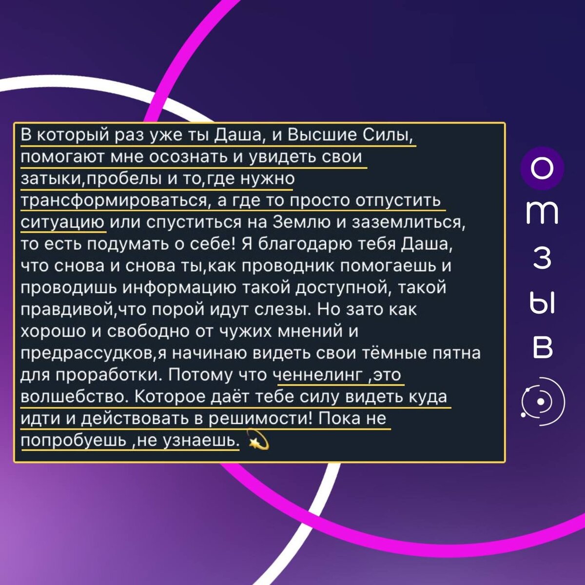 в том, чтобы не давать советы, а помогать почувствовать и понять себя Самое важное в новом времени — это выход в уникальность. Но мы не можем развиваться в ней до тех пор, пока не открываемся сами себе. Ведь внутри нас — океан знаний о своей силе и потенциале. Человек — это бескрайний космос, красивый и загадочный. И, открывая себя, мы соединяемся с ним, получая шанс вознестись над обыденными проблемами. И только в этом случае, когда мы понимаем истинную ценность своей жизни и пути, мы получаем энергию на изменения Будьте в потоке! С заботой, ваш контактер нового времени Дарья Vidvas