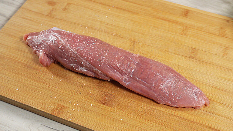 Способ приготовления: Подготавливаем свиное филе. Посыпаем солью, черным перцем. Втираем специи в мясо. Растительное масло разогреваем в сковороде. Выкладываем свиное филе в сковороду и обжариваем с каждой стороны до румяности на среднем огне. Делим пополам чеснок. Выкладываем его в сковороду. Добавляем веточки тимьяна. И продолжаем обжаривать мясо, переворачивая.