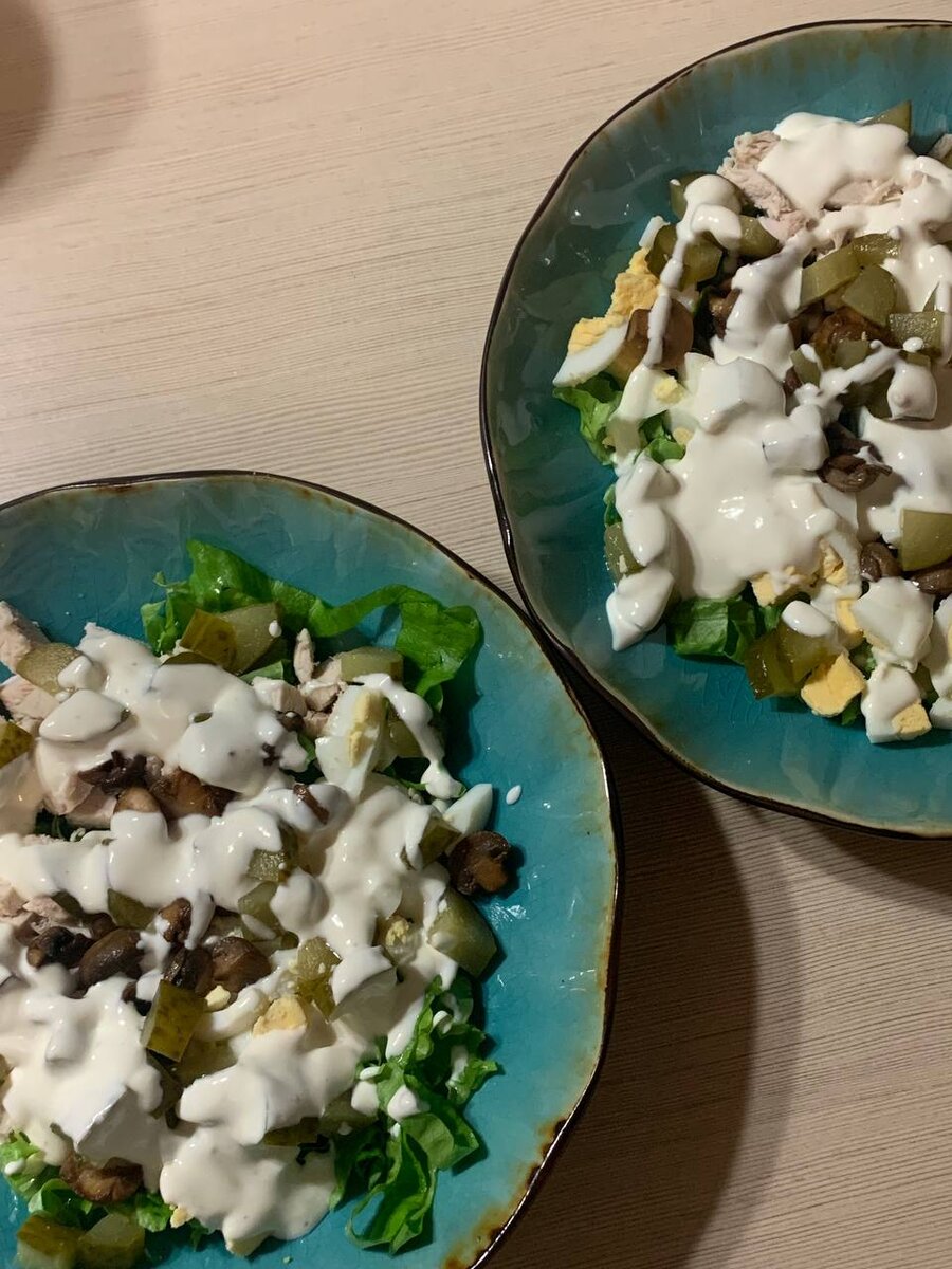 Салат с курицей, грибами и маринованными огурцами 🥗 Очень простой и сытный салат, который отлично подойдёт вам на ужин! Ингредиенты (2 порции): На порцию салата: 1. Подготовим нужные ингредиенты 2. Отварить куриное филе и яйца вкрутую 3. Промыть шампиньоны, нарезать кубиками/ломтиками, как вам удобнее 4. В сковороду налить подсолнечное масло и добавить сливочное, обжарить наши грибы 5. Посолить, поперчить и обжаривать ещё 10 минут. 6. Снять шампиньоны с огня и остудить 7. Нарезать маринованные огурцы кусочками 8. Готовую куриную грудку остудить и мелко нарезать 9. Охладить яйца и измельчить вилкой или ножом 10. В отдельной миске смешаем сметану, горчицу и соль по вкусу 11. Нарезаем лист салата и кладём его в салатницу, затем добавляем остальные ингредиенты, заправляем сметанным соусом (можно посыпать зеленью для красоты) Приятного аппетита! 🥗
