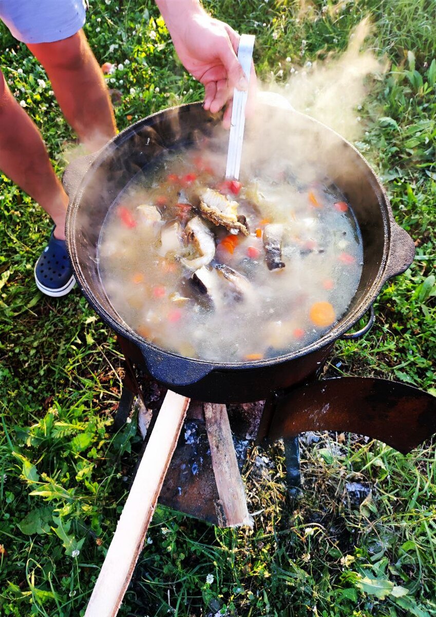 Наслаждайтесь вкусной ухой из осетрины, приготовленной на открытом огне!