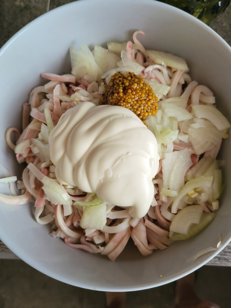 Сегодня готовила кальмаров. Рассольник и свинную поджарку еще вчера приготовила. Благо муж всеяден. Кальмаров оставила на утро. Сейчас почему-то идут скидки на них. Подороже и по "тухлее" в Магните, подешевле и по-симпатичнее в "Красной икре". Вчера отхватила аж две упаковки. Они примерно по 0,5 кг, чуть больше. Примерно на 200 рублей каждая. В морозильнике из-за скидок места не осталось. Кальмаров нельзя просто так варить. Невкусные они получаются. Резиновые и твердые. Что бы были мягкие и вкусные их надо заливать кипятком. Очистить от внутренностей, промыть и залить кипятком. И так пару раз. Дать не много настояться в кипятке, а потом его слить и тушки кальмара промыть уже обычной водой. Внешняя шкурка сама тогда слезет. Потом аккуратно просушить и резать в салат полосочками. Мясо у кальмаров становится мягким и вкусным при таком подходе. Полосочками режем лук. Как аккуратно и быстро порезать лук следующий расскажу. На самом деле в салате из кальмаров начего сложного. Кальмары
