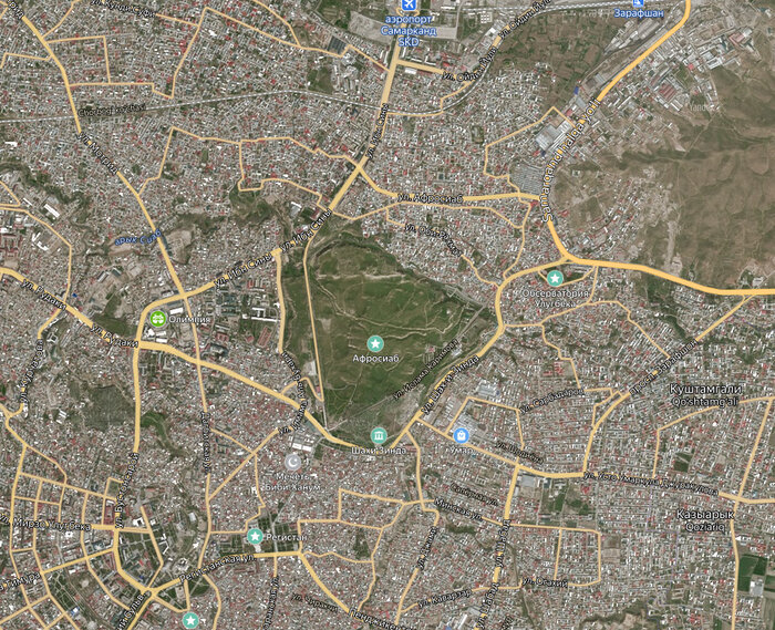 Если вы посмотрите на спутниковую фотографию Самарканда, ваше внимание наверняка привлечёт треугольник свободной земли посреди городской застройки. Перед нами - историческое городище Афрасиаб, руины древней столицы Согдийского царства.