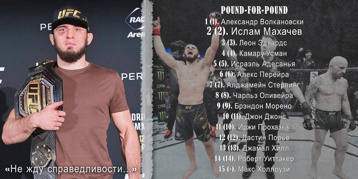 Махачев ответил на обвинения в употреблении допинга перед боем с Волкановски и прокомментировал обновленный рейтинг, где Волкановски остался на первой строчке, а Махачев на второй, хотя в бою Ислам одержал победу. «У нас есть комиссия. Я даже комментировать не хочу, потому что, у нас есть эксперты, которые работают с UFC – это USADA. Меня до боя и после боя, четыре раза проверяли. Кто-то выставлял фотографии, что у меня вена в синяке, но в Австралии была своя комиссия, которая брала кровь в неделю боя, это было в среду и фотографии начали брать с четверга, где у нас была фотосессия». Насчет рейтингов, я никогда не ждал справедливости и до сих пор не жду, потому что мы на примере других наших бойцов – Анкалаева, Петра Яна, видели отношение к нам всегда, главное, я проехал 13 тысяч километров, победил их чемпиона, мне подняли руку и с поднятой головой, уверенно и с поясом я приехал домой. Актуальный рейтинг UFC по состоянию на 15 февраля 2023 года. POUND-FOR-POUND 1 (1). Александр Волкан