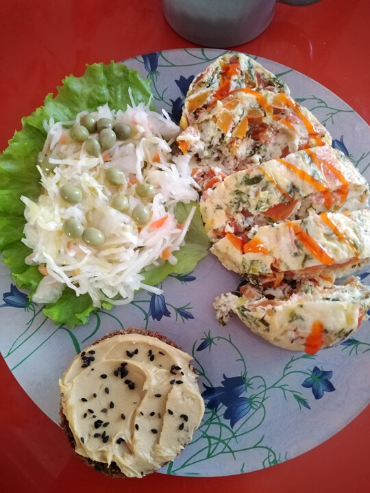 Омлет «в пакете»: Нарезаем овощи и зелень, 2 яйца взбиваем вилкой, молоко я не добавляю. Солим, перчим и смешиваем все вместе. Наливаем полученную смесь в плотный пакет, выпускаем воздух и завязываем узлом. Варим в кастрюле 20-25 минут, периодически переворачиваем. Пока омлет горячий, можно чуточку смазать сливочным маслом. Я масло льняное (чайную ложку) добавила в квашеную капусту. В качестве бутерброда – хлеб «в кружке» с арахисовой пастой без сахара. Хлеб: Клетчатка (3 ст. л.) + 1 яйцо + немного кефира для связки + сода (щепоточка) + несколько хлопьев жареного лука для аромата. Все смешала в кружке, и в микроволновке на мощности 1000 готовила 2,5 минуты. Остудить и нарезать. Напиток - чага. Больше общения и рецептов - в группе "Рецепты для диабетиков" в ВКонтакте! Рецепт на странице Автор рецепта – Надежда Викторовна