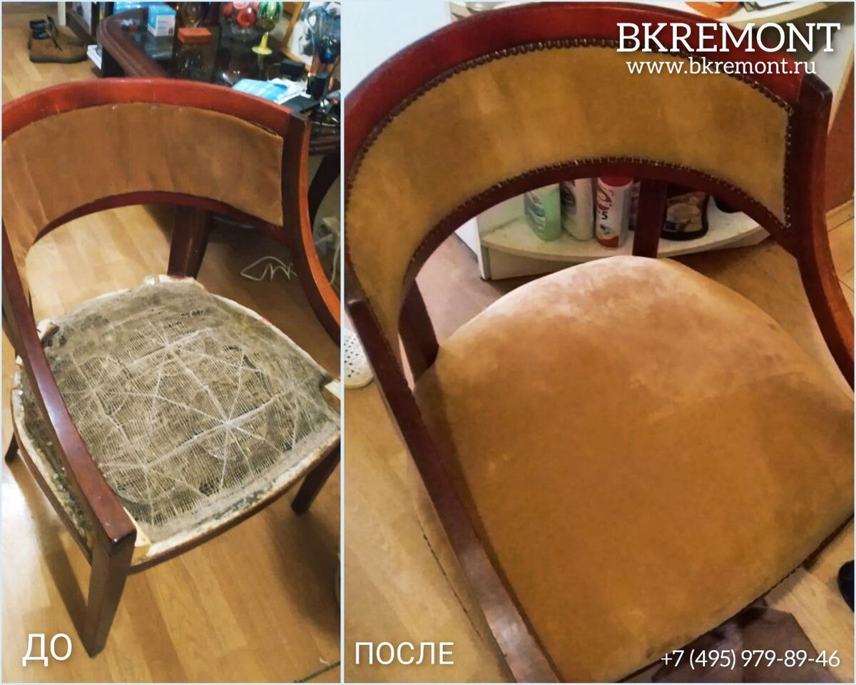 Вот несколько аргументов в пользу ремонта стульев: - ценная антикварная вещь. Это может быть старинный предмет мебели, который дорог семье или отдельному человеку. - надежный прочный каркас и удобство модели. Если каркас хорош и сама модель стула привычна и комфортна, то покупка нового стула может обернуться разочарованием. На нем может быть неудобно сидеть, материалы и комплектующие могут быть хуже качеством. - у вас уже есть все необходимое для ремонта, как в случае на фото, где ткань для перетяжки и декоративные гвозди были предоставлены Заказчиком. Поэтому здесь владельцу пришлось оплатить только работу мастеров и стоимость наполнителя Как результат? Хотите также? Звоните: +7 (495) 979-89-46 А больше о ремонте мягкой мебели читайте здесь: https://bkremont.ru/remont-myagkoj-mebeli-2/