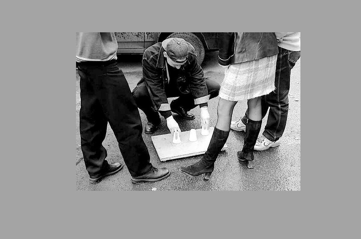 Мужик крутил стаканчики бодро и весело. Вокруг собрался народ. В этом месте было много приезжих из небольших городов, где пока такое было в диковину.