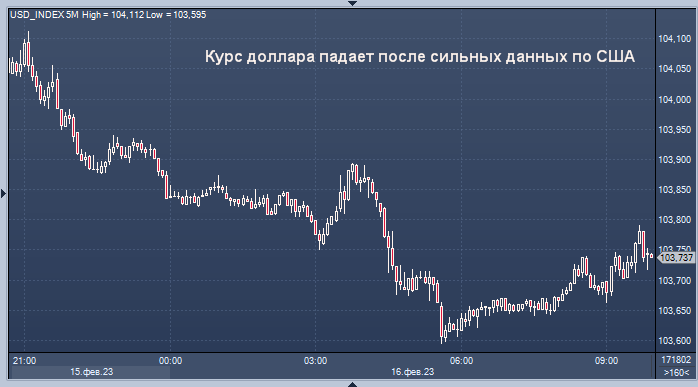 Устойчивость экономики США вселила некоторую надежду на то, что перспективы глобального роста могут оказаться не такими мрачными, как первоначально ожидалось, что подстегнуло некоторый аппетит к риску График индекса доллара интервалами в 5 минут Доллар упал в четверг, так как инвесторы продемонстрировали повышенный аппетит к риску на признаках улучшения общих перспектив глобального роста после множества сильных экономических данных по США, даже несмотря на то, что Федеральная резервная система, похоже, намерена и дальше повышать процентные ставки. Данные Министерства торговли США показали в среду, что розничные продажи в Соединенных Штатах резко выросли в январе после двух месячных сокращений подряд, что было вызвано покупками автомобилей и других товаров. Это произошло всего через день после того, как данные по инфляции в США показали, что потребительские цены замедляются, но все еще остаются стабильно высокими. Данные, опубликованные ранее в этом месяце, также показали, что рост числ