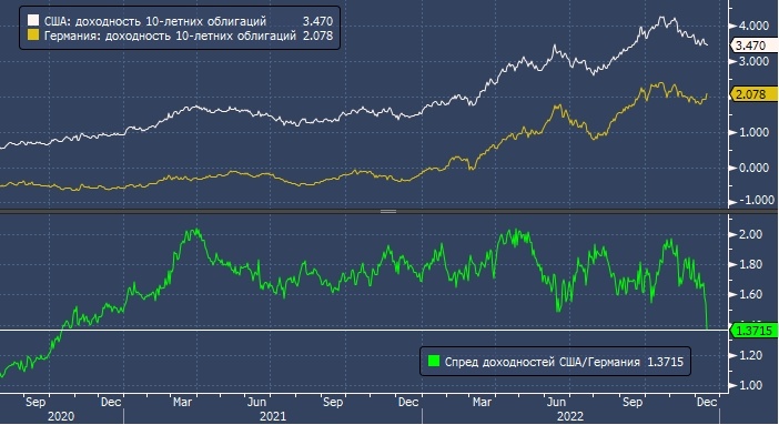Спред доходностей 10-летних облигаций США и Германии сузился примерно до 136 б.п. с почти 200 б.п. в ноябре. Спред США/Япония сократился примерно до 319 б.п. с почти 400 б.п. в октябре. Разница между текущим значением доходности 10-летних трежерис и среднем значением доходности десятилеток для стран Большой семерки составляет менее 100 б.п., что является самым низким показателем за два месяца.