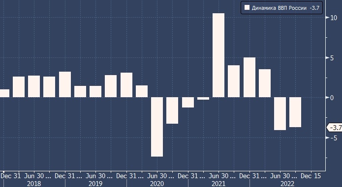 "Как сообщил Росстат, ВВП сократился на 3,7% г/г в третьем квартале 2022 после падения на 4,1% г/г во втором квартале 2022 и роста на 3,5% г/г в первом квартале 2022. Таким образом, в целом экономика сократилась на 1,6% г/г за первые девять месяцев этого года.Это предусматривает, что спад российского ВВП за 2022г должен составить всего около -2,5% г/г.Между тем мы подтверждаем наш прогноз спада, который гораздо ниже консенсус-прогноза, и в соответствии с которым спад ВВП будет значительно глубже в 2023г и может достичь -6,5% г/г", - пишет экономист.