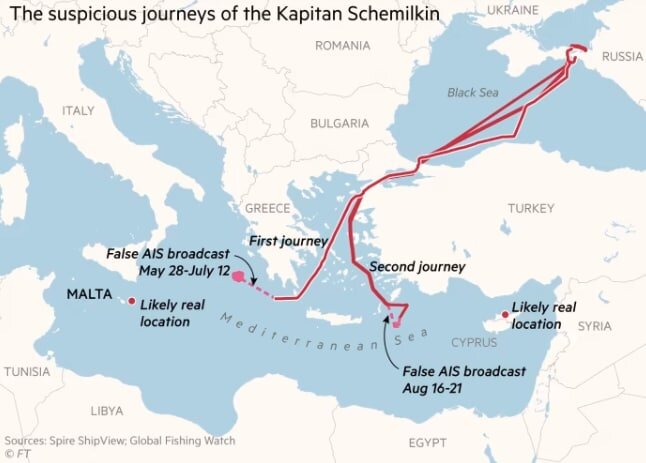 Судно сначала посетило морской причал недалеко от Мальты с мая по июль, а месяц спустя посетило электростанцию Teknecik на Северном Кипре. В обоих случаях танкер передавал ложные координаты через транспондер автоматической идентификационной системы (AIS) — устройство, которое постоянно передает координаты корабля, показывая, что он ходит кругами в греческих водах.
