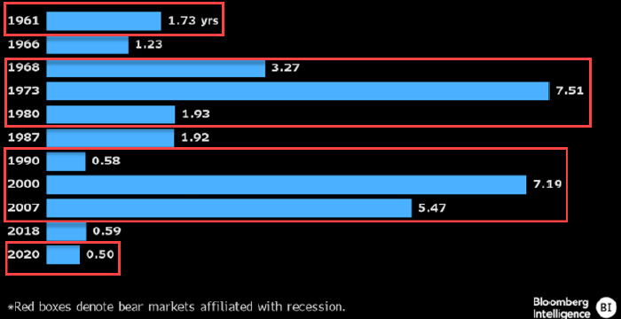 Анализ всех медвежьих рынков, которые имели место, начиная с 1960 года, показывает, что достижение предыдущего пика может занять у S&P 500 не меньше двух лет, особенно, если инвесторы продолжат опасаться прихода рецессии, пишут стратеги Bloomberg Intelligence.
