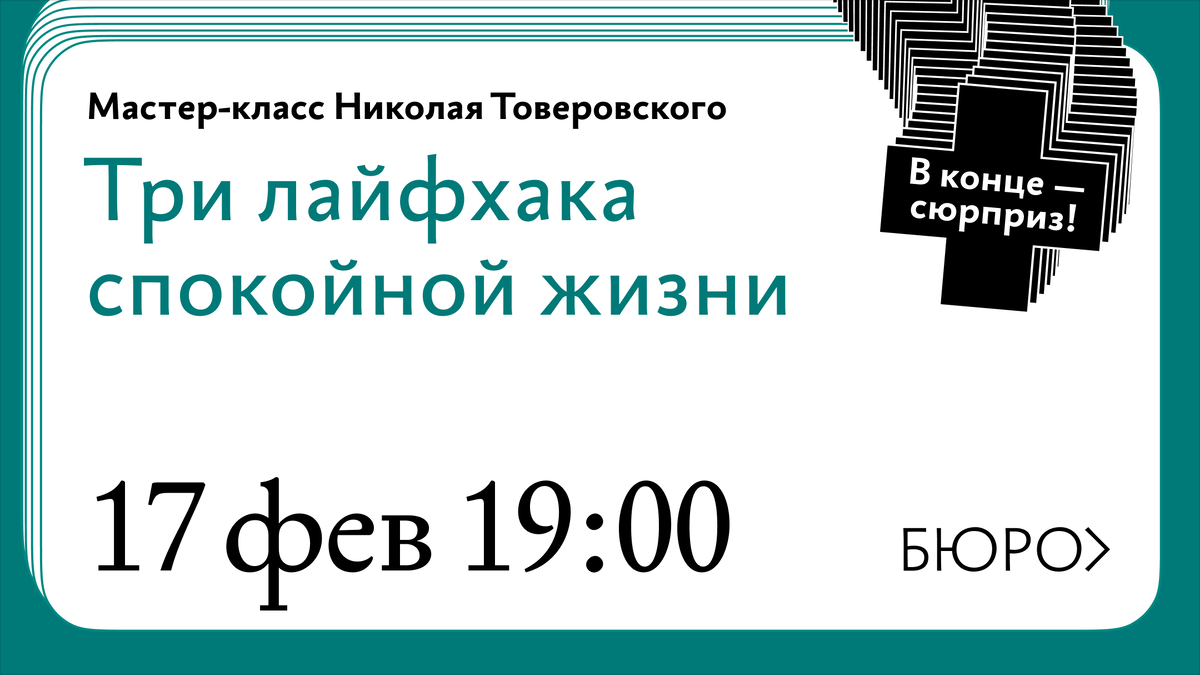 В пятницу 17 февраля 19:00 мск руководитель, автор книги «Управление проектами, людьми и собой» Николай Товеровский проведёт бесплатный мастер‑класс, на котором поделится тремя лайфхаками спокойной жизни, когда много проектов, людей и дел. Мастер‑класс пройдёт в Телеграме.