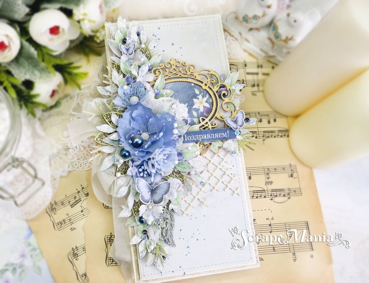 И я приготовила шоколадницу с секретом из коллекции "Небесная роса" TM ScrapMania. На основу взяла акварельную бумагу и всю конструкцию создала из нее. В качестве украшений применила цветы ручной работы, шебби-ленту, чипборд, вырезанные элементы из листов для вырезания, выпущенные к коллекции и вырубку ножами от ScrapMania. Дополнила работу разным топпингом - бусинами, мелкими шариками из пенопласта, пайетками Чудесно работу дополнила вырубка, использовала нож "Листья космеи" и нож "Листья мелкоцветов". Благодаря им композиция стала еще более богатой и разнообразной в деталях. В качестве надписи использовала ту, что располагаются на технической полосе листочков коллекции, эти надписи очень хорошо выручают, так как всегда можно подобрать нужную не только по смыслу, но и по палитре. А в качестве дополнительных декоративных элементов применила чипборд из коллекции "Наше гнездышко", чудесные перышки замечательно вписали