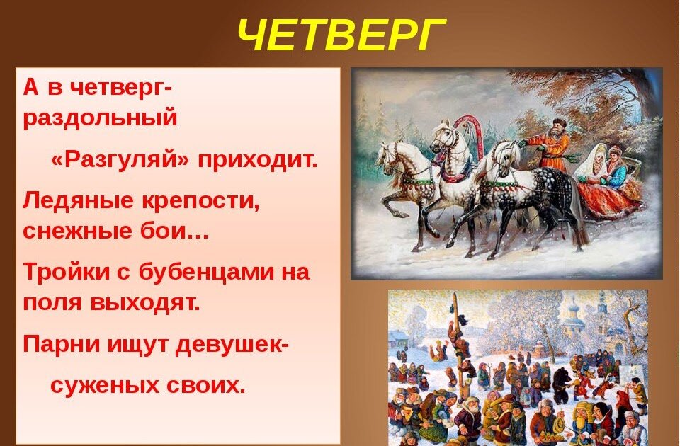 С этого дня хозяйственные и бытовые работы запрещались, в то время, как Масленичные гулянья и веселье были обязательными. В четвёртый день седмицы все катались на всём, что катится, качается, крутится и бегает: на санях, качелях, каруселях, лошадях. Не обходилось без игры в снежки и хороводов. Дети катались на салазках, которые делали из двух широких досок. Днище корени обливали водой, которая леденела и тем самым придавала скорости этому незатейливому агрегату. При том упасть или перевернуться было практически невозможно. Развлечения молодёжи были уже опаснее, а значит интереснее. Молодые люди делали слеги, на которых катались стоя вдвоём, держась друг за друга. Слеги представляли собой нечто среднее между бревном и жердиной, облитое водой и обваленное в снегу. Все катались, кричали и валялись в снегу. Разгул сложно представить без кулачных боёв, когда молодые люди шли «стенка на стенку», демонстрируя девушкам свою силу и удаль. Но отношение к этому развлечению было серьёзным: в боях