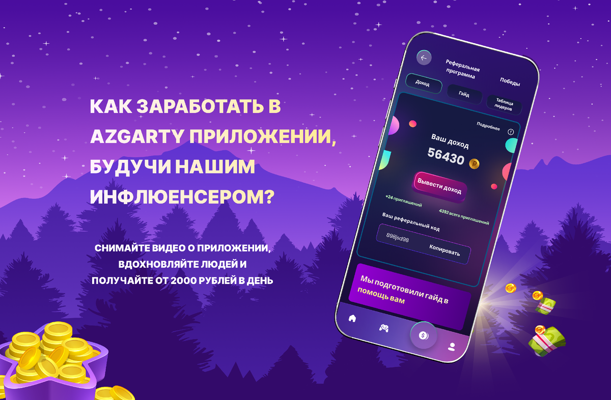 Всем привет! Если вы читаете этот гайд, значит вы хотите зарабатывать и иметь высокий доход. Все что вам нужно — стать Azgarty инфлюенсером! Вам понадобится сделать всего пару простых шагов на пути к мечте! Читайте внимательно - в середине статьи мы анонсировали наш самый крупнейший конкурс для инфлюенсеров! Наша команда верит что каждый из вас — невероятно талантливый и креативный, что каждый может раскрыть свой внутренний потенциал и получать доход в Azgarty приложении. А мы чтобы вас вдохновить и помочь вам в этом интересном путешествии, подготовили систему наград и призы за ваши усилия (действия) в социальных сетях! Что нужно сделать, чтобы стать нашим инфлюенсером и сколько вы можете заработать уже сегодня? Мы увидим ваши ролики, только не забудьте нас отметить в видео или напишите нам на почту и мы оплатим ваши старания! Теперь как именно вы поощряем каждого в AZGARTY ? 1. Наша реферальная система предлагает самую высокую комиссию за каждый переход по вашей ссылке — 10%! А в пери