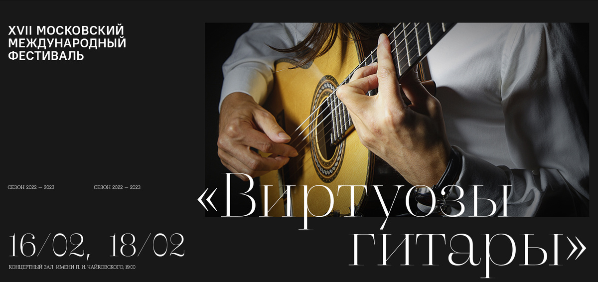16 и 18 февраля в КЗЧ лучшие гитаристы Испании, Таиланда и России соберутся для участия в XVII Московском международном фестивале «Виртуозы гитары». В программе фестиваля – российские премьеры, самые известные произведения гитарного репертуара, а также сочинения современных композиторов. Художественный руководитель фестиваля - Артём Дервоед. 16 февраля фестиваль по традиции откроется концертами для гитары с оркестром. Дебютант фестиваля из Таиланда Экачай Джеаракул впервые в России исполнит «Античный концерт» Ричарда Харви; автор музыки ко многим известным фильмам, в прошлом – участник прогрессив-рок-группы Gryphon, Ричард Харви написал его для гитариста Джона Уильямса. Знаменитый концерт «Аранхуэс» Хоакина Родриго в нынешнем году прозвучит в интерпретации испанской гитаристки Анабель Монтесинос. Завершит концерт «История танго» Астора Пьяццоллы в оркестровой транскрипции В. Венедиктова/С. Госса в исполнении Артёма Дервоеда, Юрия Медяника (баян) и Сергея Шамова (кахон, перкуссия). Конц