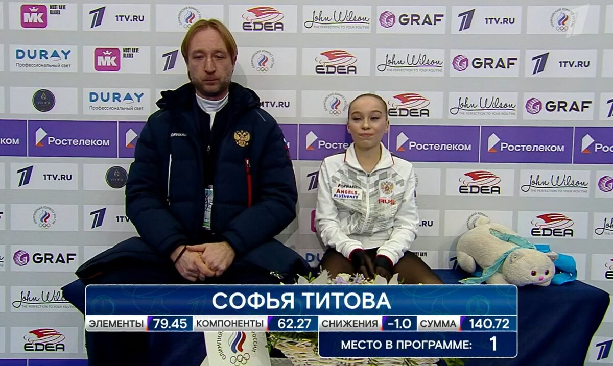 Софья Титова - истинная воспитанница своего тренера Евгения Плющенко. Именно он открыл ее талант к ультра-си, с ним она достигла своих успехов. Вообще, иногда мне кажется, что Софья даже манеру поведения своего тренера взяла. Мы уже видели от этой фигуристки истерики в КИКе после оглашения судейских оценок, игру на камеру, возмущения ее мамы в публичном пространстве. Вроде бы после того громкого скандала Титова чуть стала поскромнее. Но ненадолго. Вот и сегодня после оглашения судейских оценок за ПП Титова не сдержалась, выкрикнув, что набирала и 146 баллов с меньшим контентом. Да уж, удивительное самомнение от столь юной фигуристки. В целом, она очень так самоуверенно себя вела. После ПП, в которой ей удалось исполнить 4С, два 3А, она буквально светилась оптимизмом. Громко и четко на камеру под микрофон озвучила, что оан такая молодец не побоялась и пошла на него. В КИКе тоже они провели показательную беседу на камеру с Плющенко о том, какая она молодец. Ну а увидев оценки, сначала