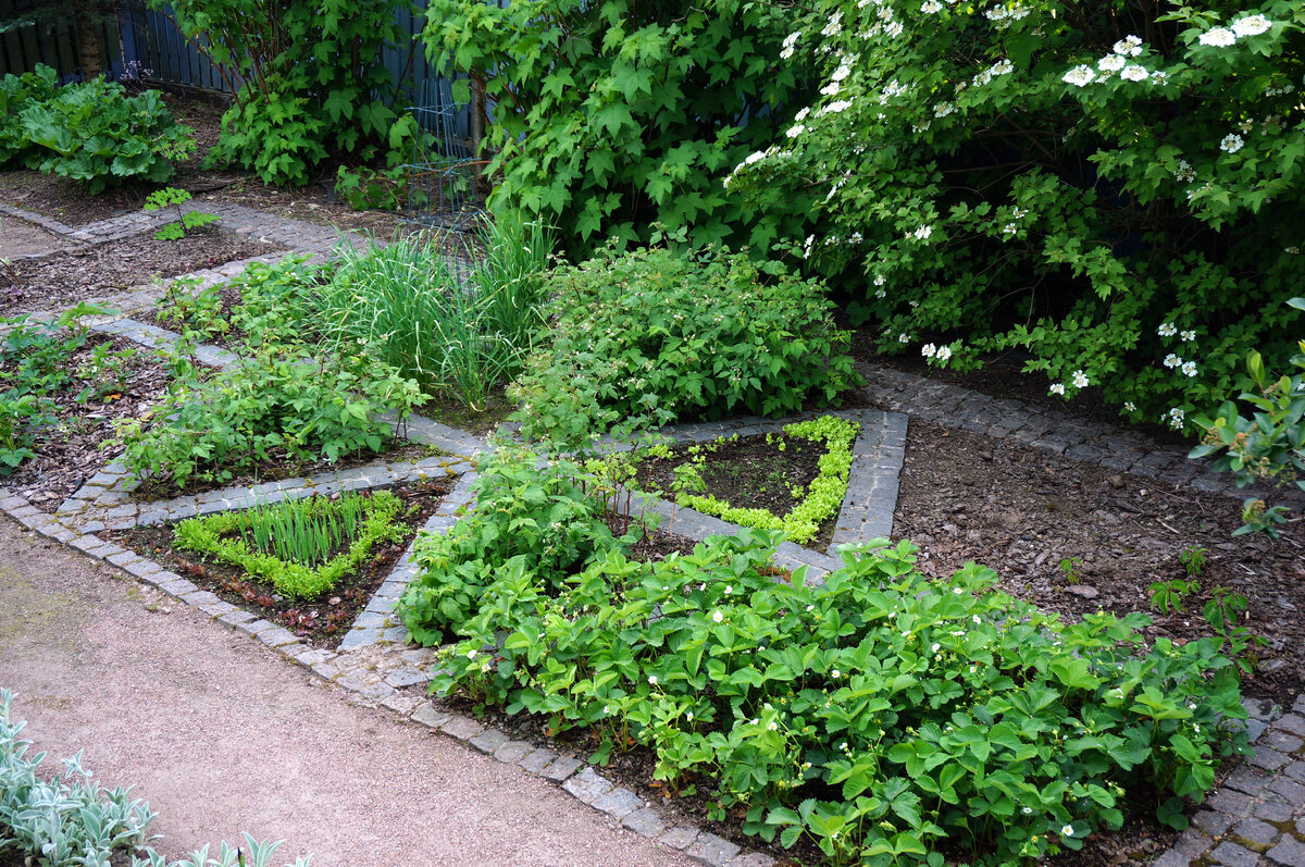 Мне хотелось бы рассказать об огороде в нашем теперь уже бывшем саду, встряхнуть, так сказать, пыль с архива за двенадцать промелькнувших лет. Выращивание чего-то съедобного мною изначально не предполагалось еще при покупке участка, но муж клятвенно заверил, что он будет сам сажать и полоть, и я сдалась. Совершенно напрасно! Хватило его, разумеется, ненадолго, а потом он тихо самоустранился, оставив меня разбираться с ситуацией самостоятельно. Тем не менее, план был нарисован, и работа закипела. Впоследствии несколько необычная форма довольно часто вызывала вопросы у посетителей, но я точно знала, что на треугольных грядках будут расти вполне себе обычные ягодки. Технологию применили ту же, что и при строительстве дорожек: канавка, подушка, гранитная брусчатка на растворе для крепости. Завидной огородницей я, разумеется, так и не стала. Единственное, что мною делалось по науке, так это выращивание по четырехпольной системе земляники садовой. Две гряды плодоносят, одна отдыхает, одна з