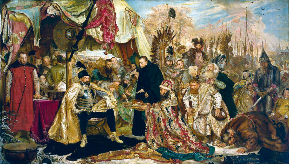 Вот тут-то в нашей истории (а мы говорим об истории картины польского маляра Яна Матейко, вы ещё не забыли?) и появляется Польша (она же Великое княжество Литовское, она же Речь Посполитая). Она ввязывается в чужую войну сразу после Виленского договора (после ликвидации Ливонской конфедерации), подхватывает упавшее знамя и продолжает Крестовый поход на восток.