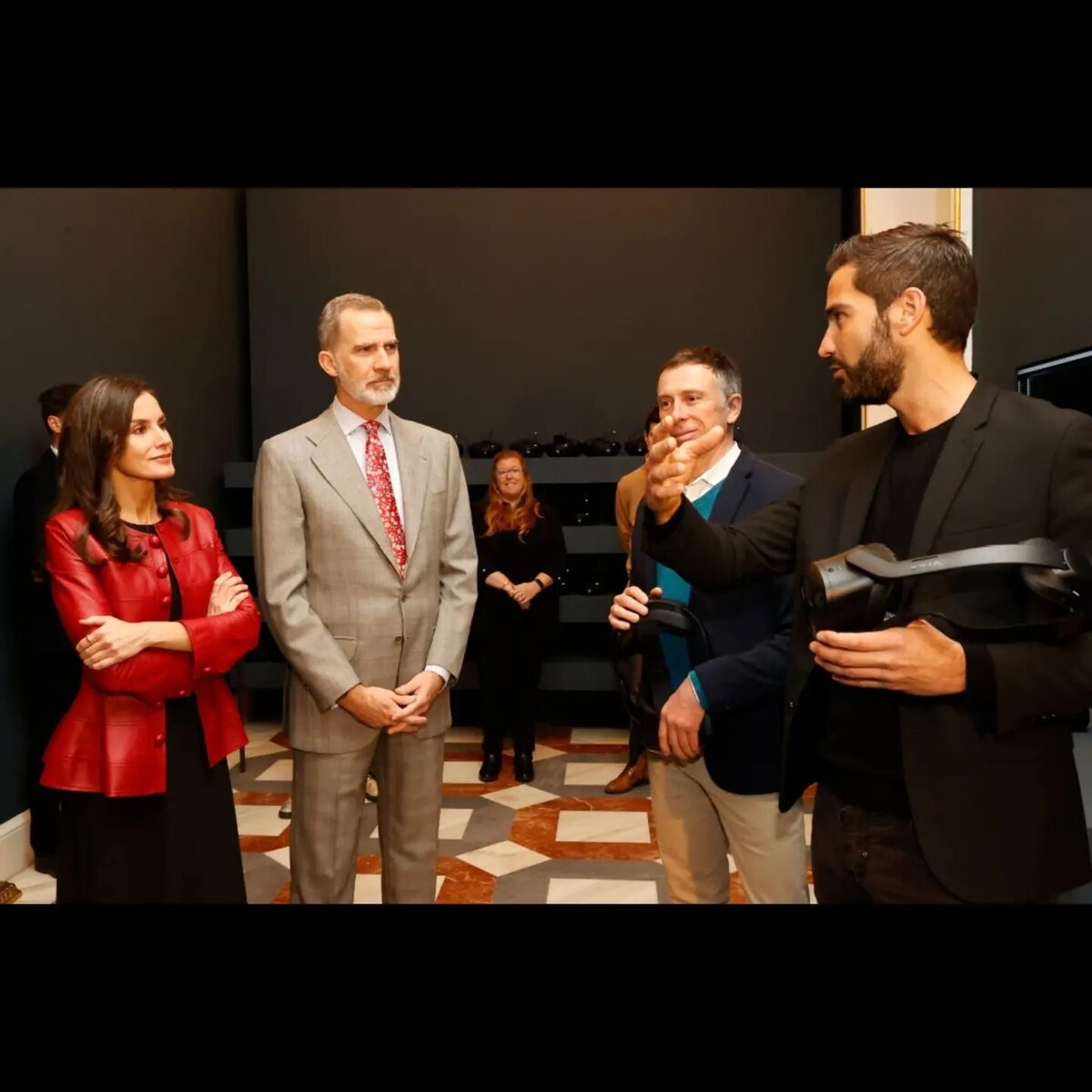 Король Испании Филипп вместе с супругой, королевой Летицией побывали на открывшейся выставке испанского художника Хоакина Сорольи: "Соролья сквозь свет", она приурочена к столетию со дня смерти художника-импрессиониста. Летиция была в черном платье-миди и красной кожаной куртке. Она держала в руках бордовую кожаную сумку и выбрала бордовые туфли-лодочки на каблуке. Король надел светло-серый костюм и бледно-голубую рубашку с шикарным красным галстуком с цветочным узором. В первый день выставки к членам королевской семьи присоединились министр культуры Испании Микель Исета, куратор выставки Консуэло Лука де Тена, бывший директор музея Соролья и Бланка Понс-Соролья, правнучка художника и эксперт в области его творчества. Выставка «Сорола сквозь свет», открытая королём и королевой в Королевском дворце в Мадриде, сочетает опыт виртуальной и сенсорной реальности с 24 оригинальными работами художника.