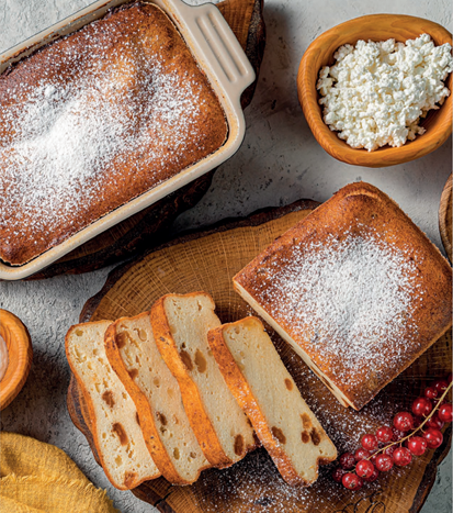 60 минут 8 порций Вам понадобятся: • Творог 9% — 600 г • Сметана 15% — 3 ст. л. • Сахар — 100 г • Яйца — 3 шт. • Манка — 5 ст. л. • Цедра апельсина или лимона — 0,5 шт. • Ванилин на кончике ножа или ванильный сахар — 1 ч. л. • Масло сливочное — для смазки формы • Разрыхлитель — 0,5 ч. л. • Изюм вымоченный — 80 г • Кедровые орешки — 20 г • Соль — несколько щепоток Рецепт: 1.В миску с творогом добавляем три столовых ложки сметаны, 100 граммов сахара, натираем теркой цедру с половинки апельсина и по вкусу добавляем ванилин и манку, оставьте немного для присыпки формы. 2. Разбиваем три яйца и разделяем их на белки и желтки. Желтки отправляем в миску с творогом, а белки в чашу блендера. С помощью блендера пробиваем творожную массу до однородного состояния. 3. В чашу миксера насыпаем половину столовой ложки сахара и взбиваем белки в густую пену. Сливочным маслом обильно смазываем форму для запекания и посыпаем масло манкой (такую «рубашку» делаем для того, чтобы запеканка не прилипала к форм