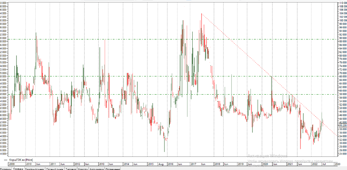Вот уже неделю роюсь в графиках второго-третьего эшелона в надежде отыскать акции с хорошими фундаментальными показателями и низкой рыночной оценкой. И наконец как мне кажется нашел. Встречайте, друзья, Коршуновский ГОК - входит в группу Мечел. Является прибыльным предприятием без долгов. Минусы с фундаментальной точки зрения: 1. не платит дивиденды, 2. прибыль направляет на займы материнской компании. Однако контора при этом всё равно не перестает генерировать прибыль. Текущая цена 40200. Цели-сопротивления сверху 58000; 68000; 90000 (чем черт не шутит). Размер бумаги в портфеле для покупки - 10%. Без стоп-лосса. Срок вложений - не менее 3-х месяцев.
