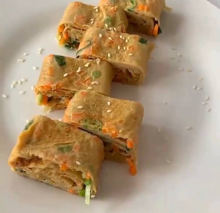КБЖУ: 147/11/9.3/3 Ингредиенты 1. Яйца взбиваем с соевым соусом. Режем мелко зелень и морковь и все перемешиваем. Жарим на среднем огне на растительном масле. Каждый раз наливать тесто на сковороду и заматывать в рулет (как показано ниже). В конце прожарить боковые части рулета и можно подавать на стол.