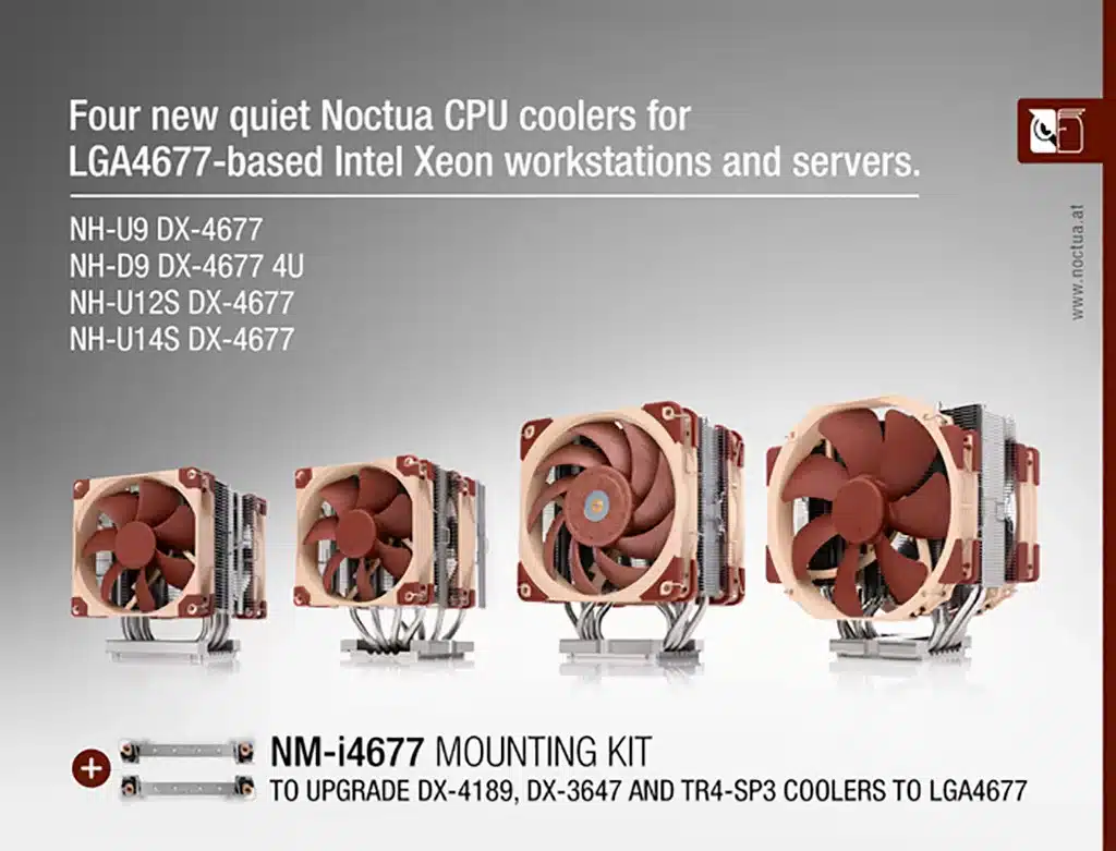 Среди производителей систем охлаждения австрийская компания Noctua первой представила модели с поддержкой новой HEDT-платформы Intel. Для процессоров Xeon W-2400 и W-3400 в исполнении LGA4677 были представлены кулеры NH-U14S DX-4677, NH-U12S DX-4677, NH-U9 DX-4677 и NH-D9 DX-4677 4U. Фактически эти модели не новые, они базируются на уже известных конструкциях, все из которых побывали на нашем Тест’О’дроме. Главное отличие заключается в увеличенном до 70х56 мм основании, и конечно в других креплениях. У некоторых моделей повышены обороты вентиляторов. Рекомендованные цены и официальные страницы: Также для владельцев кулеров Noctua линеек DX-4189, DX-3647 и TR4-SP3 доступны комплекты креплений NM-i4677 за $30. Они обеспечат совместимость с сокетом LGA4677.