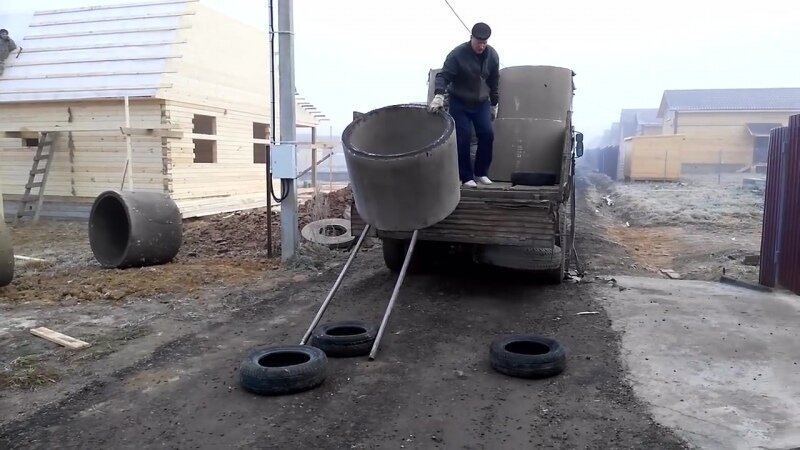 На участок привезли бетонные кольца. Привез их грузовик с полуприцепом, который долго корячился на узких улочках дачного поселка. Разгружали кольца два мужика. Они их просто скидывали с машины на огромную старую автомобильную покрышку. Удивительно, но ни одно кольцо не поломалось.