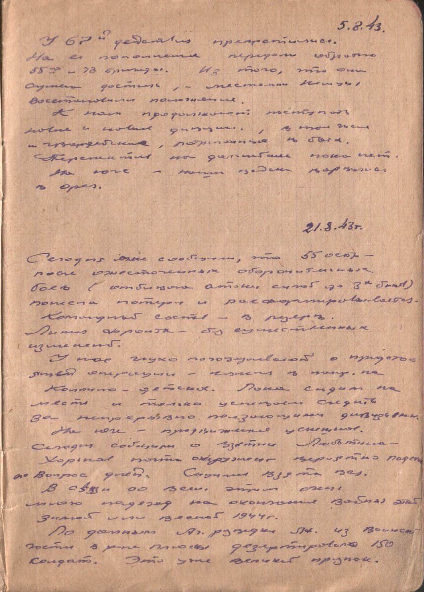 21.8.43г. Сегодня мне сообщили, что 55 ОСБр – после ожесточенных оборонительных боев (отбивали атаки силой до трех батальонов) понесли потери и расформированы. Командный состав – в резерв. Линия фронта – без существенных изменений. У нас глухо поговаривают о предстоящей операции – ??? в направлении Колпино – Детское. Пока сидим на месте и только успеваем следить за непрерывно ползающими дивизиями. На юге – продвижение успешное. Сегодня сообщили о взятии Люботина – Харьков почти окружен – вероятно падение вопрос дней. Сицилия взята вся. В связи со всем этим очень много надежд на окончание войны этой зимой или весной 1944г. По данным Армейской разведки ???, из войсковой части в районе Плюсы дезертировало 150 солдат. Это уже великий признак. Следующая страница 26.09.1943. Предыдущая страница Предисловие к дневнику здесь