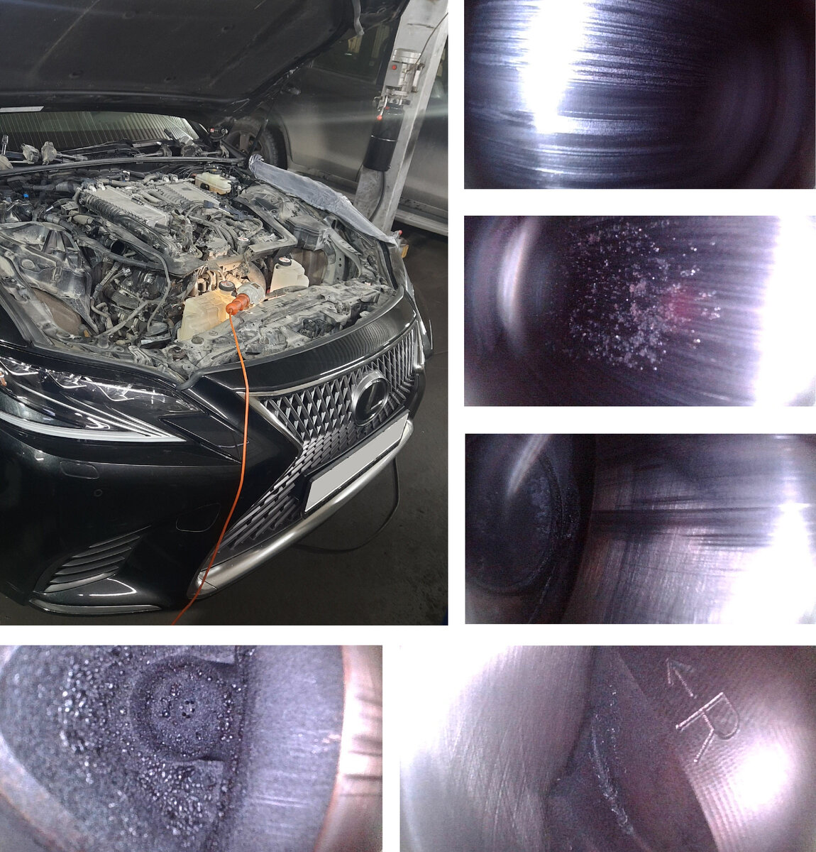 Автомобиль : LEXUS LS500. Год выпуска : 2018. Объём двигателя : 3.5 (422 л.с.). Маркировка двигателя : V35A. Тип топлива : бензин. Блок двигателя : алюминиевый с чугунными гильзами. Заявленный пробег : 150000км. Проверку заказал собственник. Появился посторонний стук мотора. Съездили к официальному дилеру, там сказали - нужно менять цепь ГРМ. Прежде, чем все разбирать, клиент решил сделать эндоскопию, чтобы подтвердить, либо опровергнуть диагноз. Оказалось дело в другом. Двигатель "задрало" и он, как это чаще свойственно корейским авто - "гремит поршнями". Двигатель оказался внутри достаточно чистый для 150тыс.км. и это норма для авто, которое в основном катается по трассе, но т.к. это турбо-мотор с непосредственным впрыском и всеми современными технологиями, то без угара масла здесь не обойтись. Так и вышло, двигатель какое то время работал на низком уровне масла. Об этом собственник признался после увиденного в цилиндрах. В итоге левую сторону "задрало". Также в некоторых цилиндрах