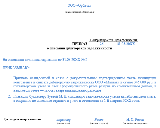 Приказ о списании дебиторской задолженности - образец 2023-2024
