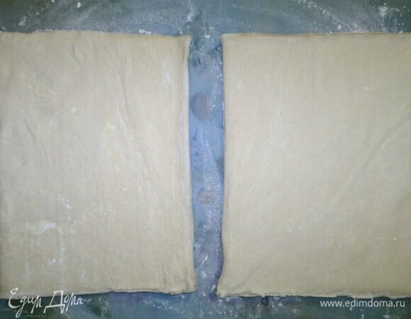 мука - 2ст. л. Шаг: 1 Слоеное дрожжевое тесто разморозить при комнатной температуре. Шаг: 2 На подпыленной мукой поверхности раскатать пласты теста, придавая форму круга. Шаг: 3 Каждый круг теста разрезать на 4 части. Шаг: 4 На боковых частях каждого сектора теста сделать по 3 параллельных надреза, не дорезая до конца. Шаг: 5 На свободную часть сектора выложить начинку. Шаг: 6 На начинку завернуть сначала один край теста с разрезами. Шаг: 7 Затем завернуть второй край теста с разрезами. Если вы начали заворачивать первую слойку с левого края, то заворачивайте так же и все остальные, и наоборот. Шаг: 8 Слойки поставить в теплое место для подъема на 1,5–2 часа. Шаг: 9 Подошедшие слойки выложить на
