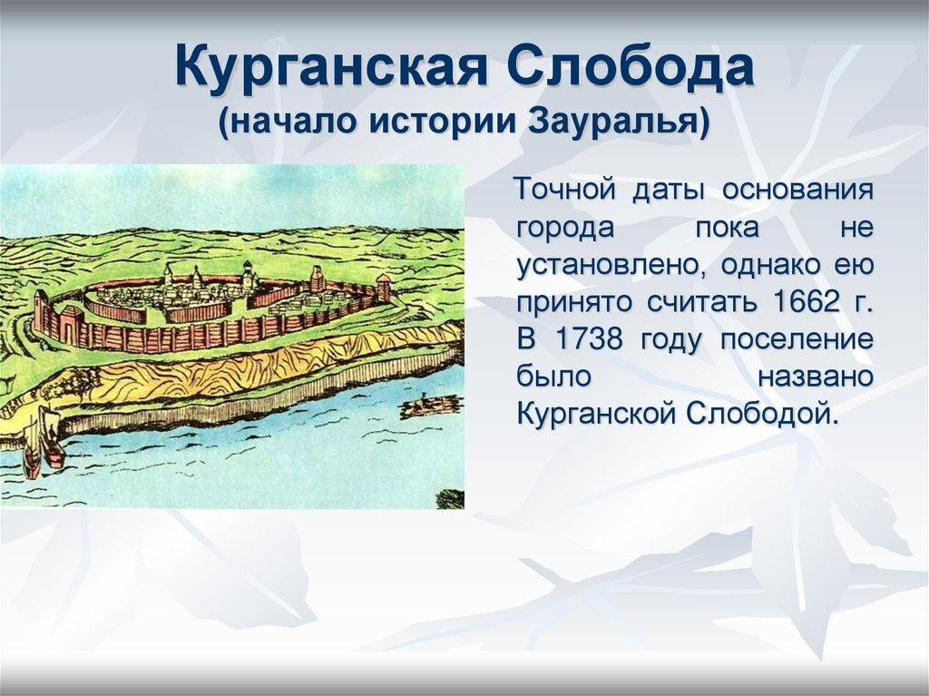 Русские люди впервые познакомились с зауральским краем в XV веке, когда оно входило в состав Сибирского ханства. Первыми инициативу по колонизации Зауралья, проявили обычные новгородские и московские торговцы, которые приобретали здесь пушнину в обмен на русские товары. На их торговых путях постепенно стали появляться промышленные поселения – слободки, зимовья городки. Шли на восток и христианские миссионеры.