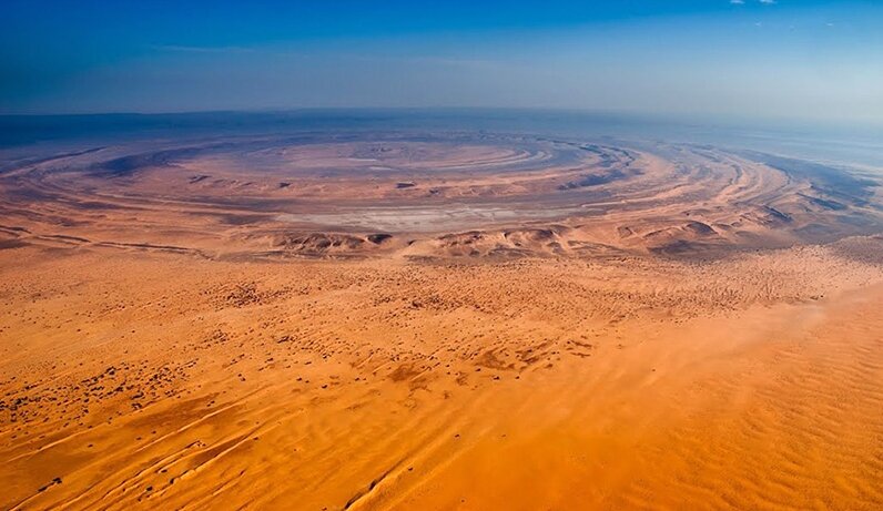 В западной Сахаре, в мавританской части пустыни Маур Адрар, в 40 километрах от поселения Уадан (Ouadane) находится структура Ришат (на местном диалекте — Гуэль-эр-Ришат (Guelb er Richat) — уникальное геологическое образование, представляющее собой серию концентрических колец и имеющее диаметр около 50 км. Это необычное явлению природы носит много красивых названий — Око Земли, Глаз Сахары, Глаз пустыни. Довольно долгое время структура Ришат служила ориентиром для космонавтов на орбите, так как представляла хорошо видимый объект на обширном пространстве ничем не примечательной пустыни. Существуют разные гипотезы возникновения структуры Ришат и до сих пор нет единого мнения. Изначально Глаз Сахары считали древним метеоритным кратером, но исследования показали, что следы удара гигантского метеорита о поверхность и горные породы со следами ударного воздействия отсутствуют. На сегодняшний день достоверной считается версия полностью геологического происхождения этих концентрических окружност