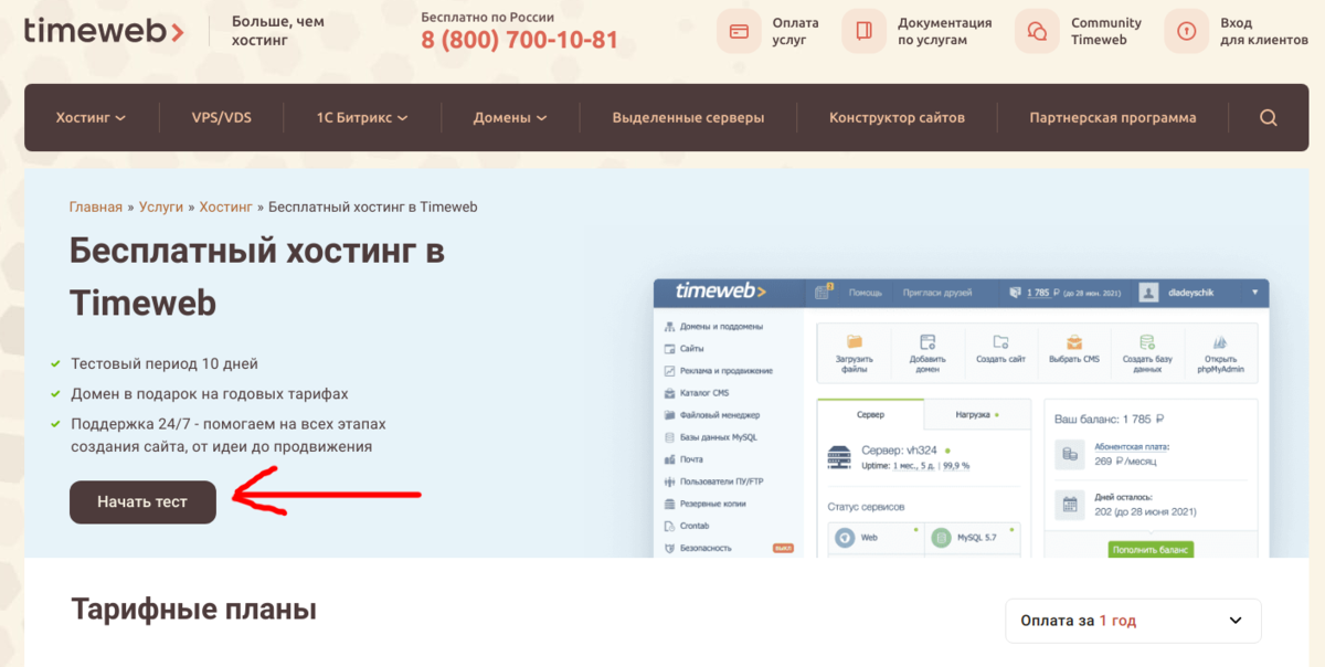 1. Создаём аккаунт на хостинге (нажимаем "Начать тест" и вводим необходимые данные).