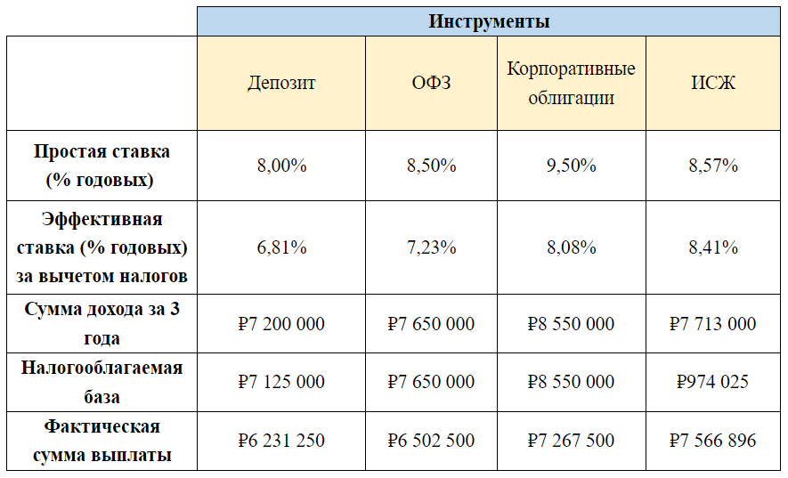 Налог на вклады снова начал действовать с 1 января 2023. Поэтому стоит вспомнить об инструментах, которые дают большие налоговые льготы без увеличения риска. Например, инвестиционное страхование жизни (ИСЖ). О разнице налогообложения ИСЖ, вкладов и ОФЗ, о преимуществах программы и о гарантированном доходе рассказали в нашем телеграм-канале "Вдумчивые инвестиции". А как делались расчеты читайте ниже. Теоретический пример расчета: Сумма инвестирования: ₽30 000 000. Срок инвестирования: 3 года. Ключевая ставка ЦБ: 7,50%. Ставка НДФЛ: 15%. Как делаются расчеты 1. Расчеты для депозитов По депозитам действует льгота на проценты, полученные с ₽1 млн в год по ключевой ставке. В примере предполагаемая ставка 7,5% ₽1000 000 * 7,5% = ₽75 000 Рассчитываем налогооблагаемую базу. Так как на сумму ₽75 000 НДФЛ нет, ее необходимо вычесть из общей суммы дохода. ₽7 200 000 – ₽75 000 = ₽7 125 000 Процентная ставка по НДФЛ в России прогрессивная. До ₽5 млн удерживается – 13%, все что свыше – 15%. Ра