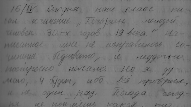16 апреля. Сегодня наш класс писал сочинение «Печорин – молодой человек 30-х годов 19 века». Написанное мне не понравилось, сочинение бедновато, и неудачно построено начало. Но я думаю, 4 будет, ибо все проверил, и не один раз. Погода сегодня не поймешь, какая, то дождик, то снег, то град, а то солнышко. Придя со школы, я сходил в магазин, пообедал, пошел в библиотеку взял книгу Шундика «Быстроногий олень». Начал читать. Пришел Леня. Я стал делать уроки, но делал рассеянно, часто отвлекался. Да и к экзаменам я готовлюсь что-то вяло: билетов совсем не учу. Сделав, наконец, уроки, я пошел с Леней гулять по железной дороге. Мы решили гулять с таким расчетом, чтобы к 8.30 вернуться, смотреть кино «Тигр Акбар». Я нашел новый коробок и Леня тоже. На обратном пути произошел небольшой случай: впереди ехал поезд, а перед нами был мостик. Мы решили его пробежать до проезда поезда и припустились со всех ног. Поезд несся стремительно, с каждой секундой приближаясь. Мы проскочили мостик и скатились по откосу. В это время поезд пронесся мимо, и машинист выпустил в нас струю пара. Струя была так сильна, и вылетела с таким шипением, что я чуть не упал.