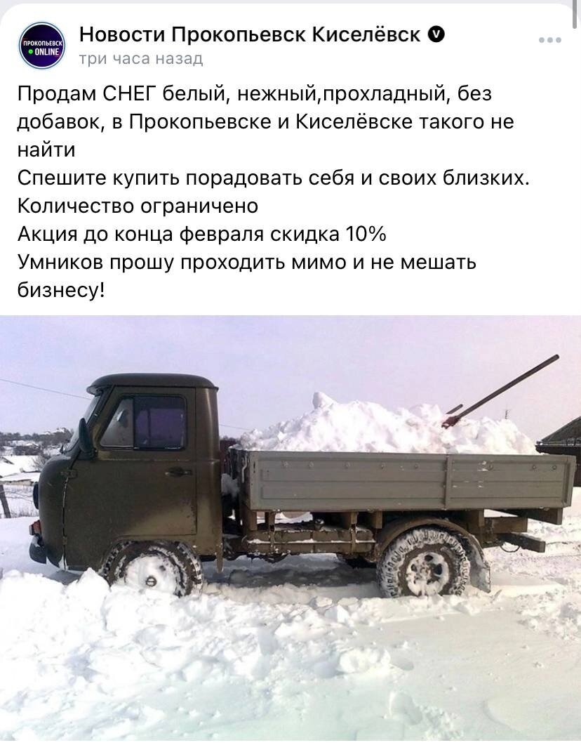 Необычные предложения опубликовали на сайте объявлений в Кузбассе. Все желающие могут приобрести...снег. Причем по акции со скидкой 10 процентов. Количество ограничено, а вот за качество продавец ручается. Уж точно про кузбассовцев не скажут, что у них снега зимой не выпросишь. Да пожалуйста! ....Доставка гарантирована! Вести-Кузбасс | @Vesti_Kuzbass42