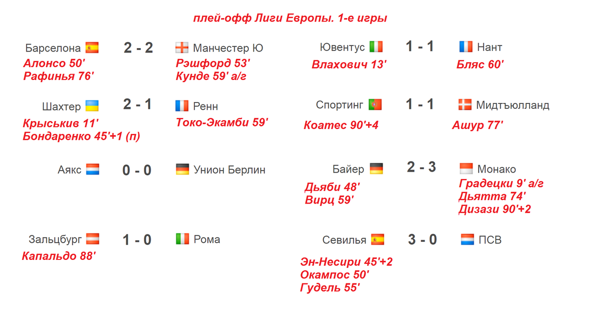 В Лиге Европы прошли стыковые матчи. Кто одной ногой в 1/8 финала, а кто фактически лишился шансов? Барселона отыгралась в матче с Манчестер Юнайтед 2:2. Рафинья в связке с Левандовски спасли «каталонцев». Ответные игры пройдут через неделю, 23 февраля. Знаете ли вы, что Барселона имела перед матчем 11 побед подряд во всех турнирах. Последнее поражение команде Хави нанесла 4 месяца назад Бавария в Лиге Чемпионов. Ювентус, несмотря на высокий коэффициент букмекеров, не сумел обыграть Нант 1:1. Ничью Нанту на 60-й минуте принёс Бляс. Обе команды имеют по 4 матча без поражений (три победы и ничья). Шахтёр выиграл у Ренна 2:1. Шахтёр провел первую официальную игру в Новом году. Однако, в 2023 году было 5 товарищеских матчей – 3 ничьи, победа и поражение. Спортинг в добавленное время вырвал ничью на своем поле с Мидтьюлландом 1:1. Это третья игра команд в истории. В 2001 году Спортинг победил в 1/64 финала Лиги Европы по сумме двух матчей 2:0. Аякс и Унион разошлись миром 0:0. Аякс не знает