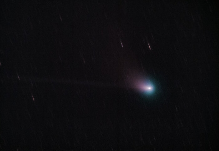 Приняв во внимание критику и советы из ветки данного комментария #comment_263746747 переснял комету и делюсь полученными результатами!) Удалось запечатлеть и пылевой, и ионный хвост космической странницы) @rr.nn, все таки удалось поймать сквозь пасмурное небо) Снято на Canon 1100Da + фильтр SVBONY UHC Телескоп: Ньютон Synta 150/750 Монтировка: EQ 3-2 с моторами. Сложено в DSS 197 кадров х 8 сек, ISO 1600 Общая выдержка: 27 минут Обработка в Lightroom Калибровочные флеты, дарк флеты, биасы, дарки Зона засветки: Оранжевая Место съёмки: Ростовская область, Каменский район. P.s. Спасибо огромное всем кто подписался! Кому не жалко можно скинуть автору на чай, печеньки и новое оборудование;) Пост автора Zeratonus. Узнать, что думают пикабушники.