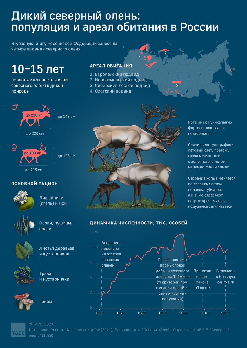 Подробнее об образе жизни, физиологии и динамике популяции диких северных оленей — в инфографике ТАСС.
