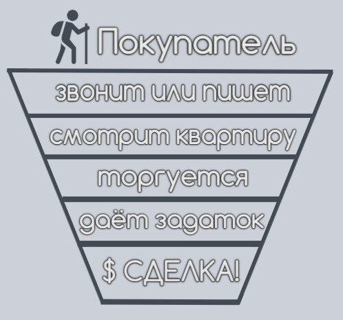 Мы ещё не освещали тему показов, но начнём затрагивать её уже сейчас, когда будем рассматривать типичные ошибки продавцов, из-за которых процесс продажи "застревает" на месте. Мы делаем это здесь, так как ошибки уже могли быть допущены, и без их решения дальше не продвинуться. Как мы уже и говорили, все эти проблемы поможет решить восприятие пути потенциальных покупателей к продавцу в виде воронки, так как наш путь к результату - это их шаг от одного этапа воронки к другому. Давайте напомним себе, как она выглядит, и будем двигаться поэтапно, говоря о потенциальных проблемах по мере их возможного возникновения.