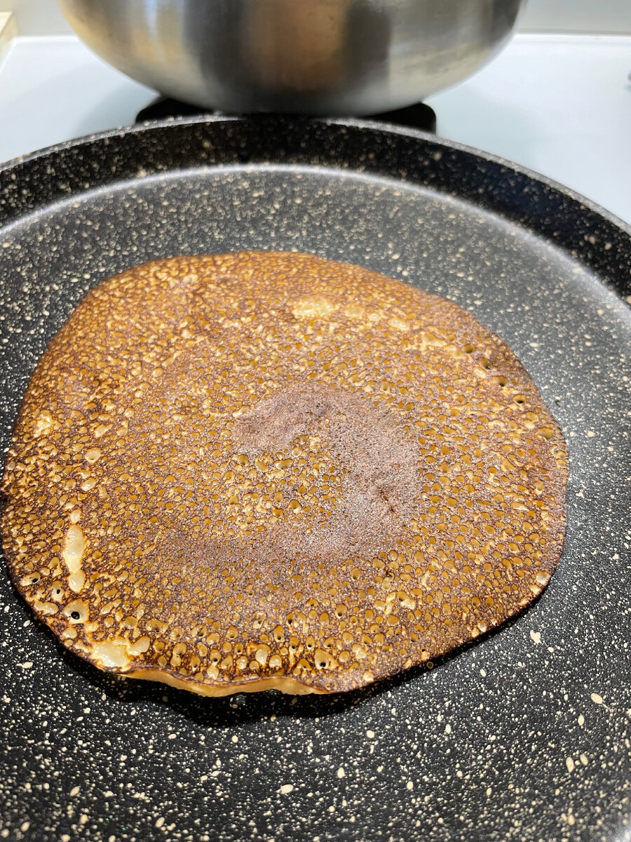 В Париже на каждом шагу пекут блины, вернее крепы и галетты, а еще вернее пекли, когда я была там в 2018 году. Я пробовала их с разными начинками и это было волшебно, вот поэтому решила дома повторить причем именно гречневые для аутентичности. Ингредиенты: 70 гр - Мука гречневая 100 гр - Мука пшеничная 3 шт - Яйца 500 мл - Молоко 1 ст.л - Сахар 80 гр - Растопленного сливочного масла (я правда взяла растительное) щепотка соли Процесс: 1. Проще простого: смешать все ингредиенты, дать постоять 15-30 мин. 2. Сковороду разогреть, можно смазать немного сливочным маслом, наливаем тесто, выпекаем пока поверхность не станет матовой и переворачиваем на другую сторону, допекаем. Готово на раз, два.