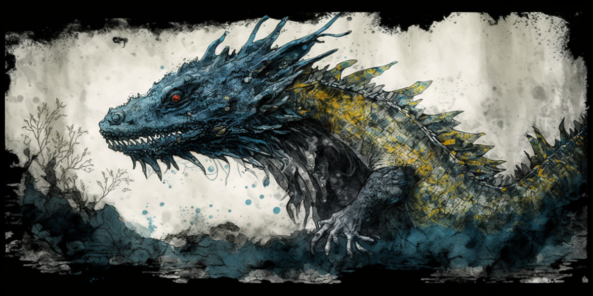 Гиотаку криптида-дракона, абстрактный, китайская тушь, штрихи цвета для выделения деталей, Лавкрафт, тревожная причудливость, паранойя, гиперреализм, пленка 70 мм, синемаскоп, зернистый фильтр.